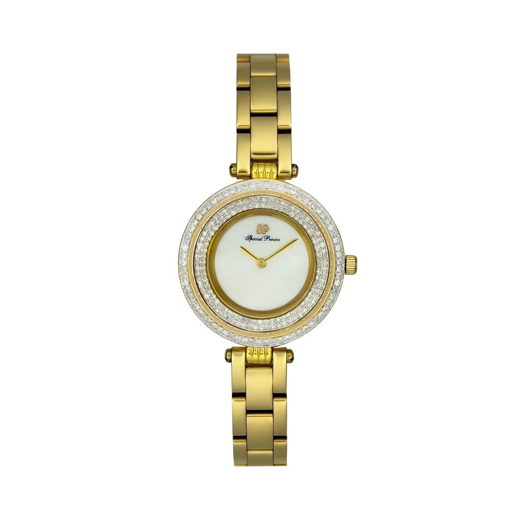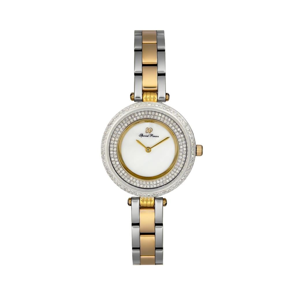 ساعة ألماس نسائية بسير من الستانلس ستيل الفضي والذهبي، تتميزك بتشبع الميناء بالالماس وتصميمها الملفت مع اطار متناسق يتلألأ بفصوص الألماس الذي يضيف لإطلالتك لمسة الفخامة والرقي.